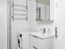 - Pesutilojen varusteet: WC-istuin, suihku, suihkuseinä, pesukoneliitäntä, peilikaappi, pesuallas, allaskaappi ja bidee-suihku.