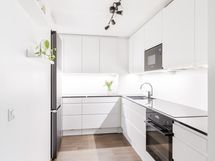 LG erikoiskorkea jää-/pakastinkaappi. Kalusteisiin upotettu AEG.n uuni (pyrolyysi ja höyrytoiminnolla). Integroitu AEG.n astianpesuko ja Boshin mikro. Led-työvalot ja kivityötaso. Savo liesituuletin (aktiivihiili).