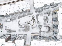 Isommasta makuuhuoneesta yhtiön sisäpihalle. Ilmansuunta etelään.