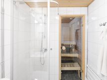 - Sähkökiuas (Harvia), ikkuna ja täyslasinen ovi.