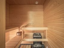 - Kuvaus: Saunan lattia on laattaa ja seinät on paneloitu. sähkökiuas
