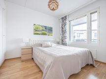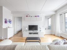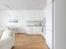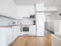 - Avokeittiön lattia on parkettia ja seinät on maalattu. Työtasot laminaattia ja välitila kaakeloitu. Liesi, liesituuletin, astianpesukone, jääkaappi-pakastin.