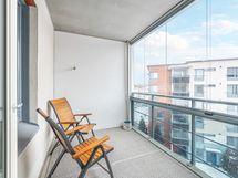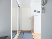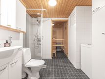 - Pesutilojen kuvaus: Kph//s/wc:n lattia on laattaa ja seinät on kaakeloitu. Suihku, suihkuseinä, allas, allaskaappi, peilikaappi, kaappi. Pesukone- ja kuivausrumpuliitäntä.