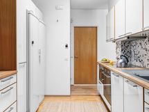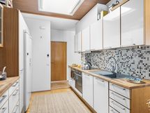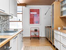 Keittiön lattia on parkettia, seinäpinnat maalattu valkoiseksi. Katto on samaa paneelia kuin olo- ja ruokahuoneessa.