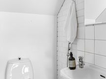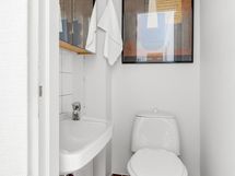 Yläkerran wc:n lattia on keraamista laattaa, seinät ja katto maalattu vaalein sävyin. Alakerran wc:ssä samat materiaalit. .