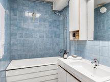 - Pesutilojen kuvaus: Yläkerran tilavassa kylpyhuoneessa on allaskaapistojen lisäksi reilun kokoinen kylpyamme. Valoa tilaan antaa kaunis kattoikkuna. Lattia ja seinät keraamista laattaa rakennusajalta.