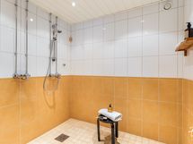 Alakerran kylpyhuone sijaitsee saunan yhteydessä Tilava kylpyhuone on kauttaaltaan laatoitettu. Erillisen WC:n kuvaus: Asunnossa on kaksi erillistä wc:tä.