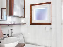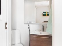 - Pesutilojen varusteet: Suihku, pesuallas, pesukoneliitäntä, suihkuseinä, allaskaappi ja peilikaappi. Pesutilojen kuvaus: Kylpyhuone on rauhallisen tyylikäs. Erillisten WC:n lukumäärä: 2. Erillisen WC:n varusteet: WC-istuin, pesuallas, allaskaappi, peili ja kylpyhuonekaappi. Erillisen WC:n kuvaus: Erillinen wc sekä ylä- että alakerrassa. Alakerran wc järkevästi eteisen yhteydessä.