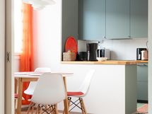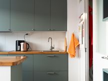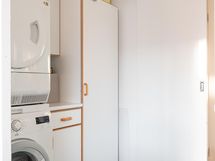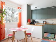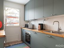 - Keittiön varusteet: Jääkaappipakastin, erillisuuni, liesi, liesituuletin ja astianpesukone. Liesi: Induktioliesi. Työtason materiaali: Puu.