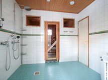 - Kuvaus: Sauna: Sähkökiuas, seinät paneelia, ikkuna, säleverhot, lauteet ja lattia laattaa.