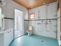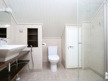 Yläkerran kylpyhuone/wc: Suihku normaalilla ja sadesuihkupäällä, suihkuseinä, maljalavuaari, lavuaaritaso ja -hylly puuta, seinäkaappi, wc-istuin, bidee-suihku, säilytyskomero, seinät kaakelia ja lattia laattaa. Yläkerran kylpyhuoneessa on Laattapisteen kalusteita. Erillisen WC:n kuvaus: Alakerran erillis-wc: Lavuaari, laminaattitaso, kaappeja, peili, kiinteät valaisimet, bidee-suihku, wc-istuin, ikkuna, seinät laatoitettu ja lattia laattaa.