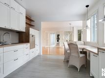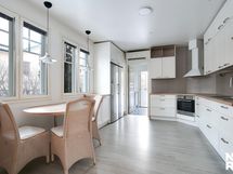 - Keittiö (Noblessa): Boschin iso pakastin ja iso jääkaappi, astianpesukone ergonomisella korkeudella, liesituuletin, erillisuuni, induktiotaso, laminaattitaso, kaksi tiskiallasta, välitila laattaa, kiinteitä valaisimia, hyllyjä, lasiyläkaappi, saareke kaapeilla, kiinteä ruokapöytä, seinät maalattu ja lattia vinyylikorkkia.