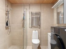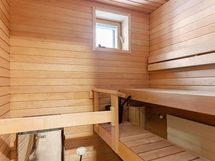 - suihku, suihkuseinä, allaskaappi, peilikaappi, pyykinpesukoneliitäntä, wc-istuin, bidee-suihku, pyyhekuivain ja ikkunallinen sauna