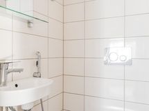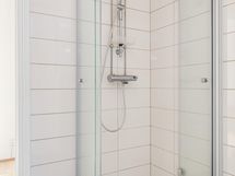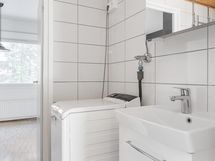 - Kylpyhuone, suihku, suihkuseinä, peilikaappi, allaskaappi, pesukoneliitäntä, kiinteät valaisimet. Pesukone kuuluu kauppaan.