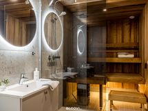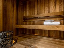 - Saunan kuvaus ja lisätiedot: Lauteisiin upotettu Harvia-pylväskiuas (sähkö). Lattia on keraaminen laattalattia, seinät ja katto puupaneloitu. Lattialämmitys (vesikiertoinen). Sauna erottuu kylpyhuoneesta lasiseinällä.