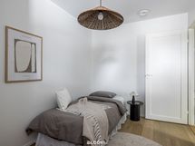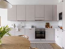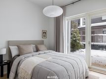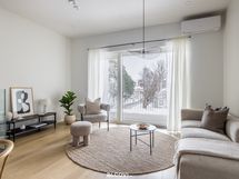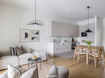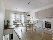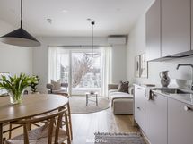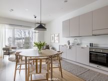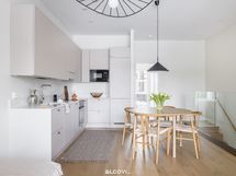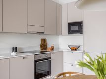 kalusteuuni, mikroaaltouuni, induktioliesitaso ja liesituuletin. Lattia on parkettia, seinät ja katot tasoitetut ja maalatut. Katossa upotetut led-spotit, lattialämmitys (vesikiertoinen).