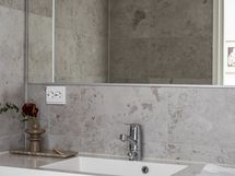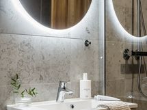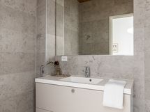 - Pesutilojen kuvaus: Kylpyhuoneita on 2 kpl. Yläkerran kylpyhuoneen varustukseen kuuluu sadesuihku, lasinen suihkuseinä, allaskaappi (Puustelli), peili, bidee- suihku ja wc-istuin. Alakerran kylpyhuoneen varustukseen kuuluu allaskaappi (Puustelli), valaistu pyöreä peili, sadesuihku, lasinen suihkuseinä, wc-istuin ja bidee-suihku. Lattiat ovat keraamista laattaa, seinät laatoitetut ja katot paneloitu. Katossa upotetut led-spotit, lattialämmitys (vesikiertoinen).