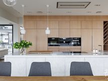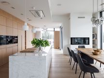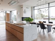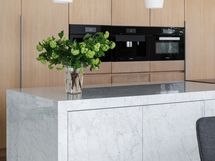 Suuri marmori saareke, johon on upotettu suuri induktioliesi ja tiskiallas.