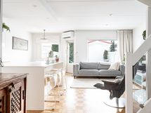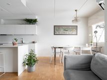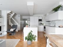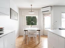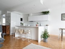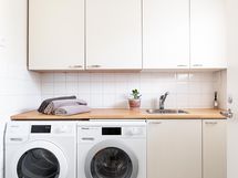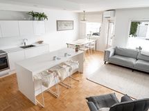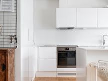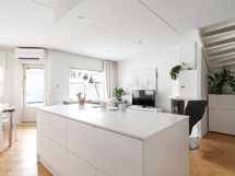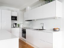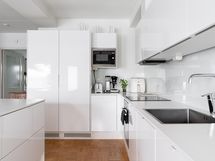 - Keittiön varusteet: Keittiösaareke. Työtason materiaali: Kvartsikomposiitti. Ala-Carte keittiö, remontoitu 2016, valkoiset korkeakiiltoiset kaapistot, kaikki kodinkoneet AEG-merkkisiä: täyskorkeat jääkaappi ja pakastinkaappi, induktioliesi, Franken liesituuletin, astianpesukone.