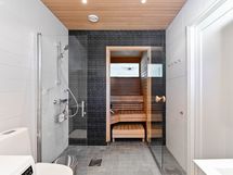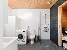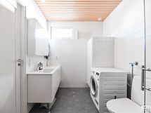 - Pesutilojen varusteet: WC-istuin, pesukoneliitäntä, peilikaappi, allaskaappi, lattialämmitys, suihku, suihkuseinä ja bidee-suihku. Pesutilojen kuvaus: Siistikuntoinen ja kaunis kylpyhuone.