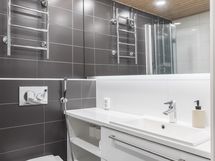 - Pesutilojen varusteet: WC-istuin, suihku, suihkuseinä, pesukoneliitäntä, lattialämmitys, peili, pesuallas, allaskaappi ja bidee-suihku.