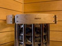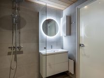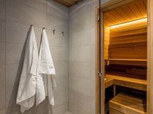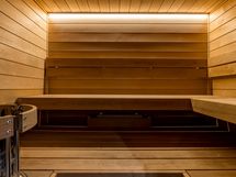 Kylpyhuoneen yhteydessä sauna, mittatilauslauteet tervalepästä (Finlaude Lux), Harvian Glow- kiuas, valokaulus kiukaan ympärillä, lednauha löylyhuoneessa. Lukittava lisäväliovi.