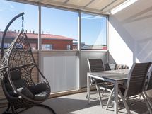 Parveke: UV-kattomarkiisi käsiveivillä, parvekesälekaihtimet, mittatilausmatto.