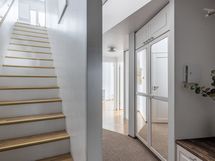 Eteinen: mittatilauslaatikosto tammitasolla, peilikenkäkaappi, Elfa-säilytysjärjestelmä, peiliovien uusiminen eteisen kaappiin, peililiukuovikaapisto Elfa-järjestelmällä, sisalmittatilausmatto (muotoon leikattu irtomatto, mattoliike Helma)