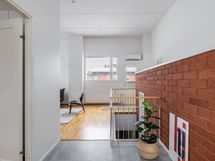 Olohuone: Ilmalämpöpumppu asunnon viilentämiseen, verhokisko katonrajaan.