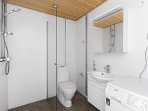 - Pesutilojen varusteet: WC-istuin, suihku, suihkuseinä, pesukone (AEG), peilikaappi, lattialämmitys, pesukoneliitäntä, allaskaappi ja bidee-suihku.