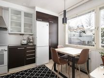- Tummanruskeat kaapistot, laminaattitasot. Jääkaappipakastin, keraaminen liesi, liesituuletin, astianpesukone. Seinät maalattu, lattia parkettia.