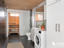 - Pesutilojen kuvaus: VARUSTUS: Wc-istuin, suihku, suihkuseinä, pesukoneliitäntä, kylpyhuonekaapisto, lattialämmitys, peilikaappi, allaskaappi.