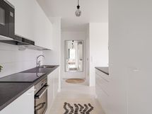 Tyylikässä keittiössä on käytännöllinen saareke, reilusti kaappi- ja laskutilaa sekä laadukkaat integroidut kodinkoneet.