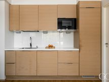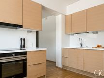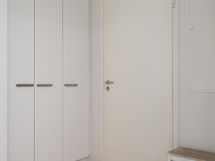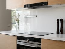 Modernissa keittiössä on kaunis puunsävyinen ilme, runsaasti kaappitilaa sekä integroidut kodinkoneet, jotka viimeistelevät yhtenäisen kokonaisuuden. Eteisessä on hyvin säilytystilaa ja kattoon upotetut spottivalot tuovat tilaan näyttävyyttä.