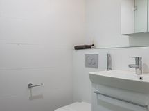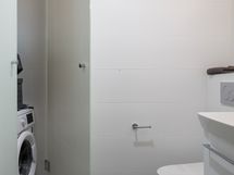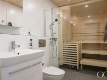 Tyylikäs kylpyhuone ja sauna muodostavat laadukkaan kokonaisuuden – saunassa lasiseinä tuo avaruutta ja modernia ilmettä. Lisäksi asunnossa on erillinen wc, jossa on fiksusti lasiovien taakse sijoitettu paikka pyykkikaapille ja pesukoneelle; tilaan mahtuu tarvittaessa myös pesutorni.