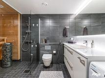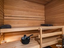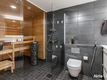 - Kuvaus: Lasiseinäinen sauna, kaikki lattiat kaakeloitu ja seinät paneloitu. . sähkökiuas