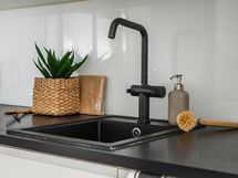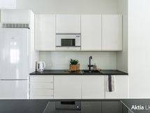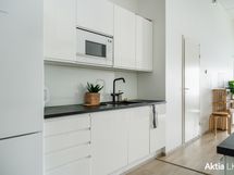 - Keittiössä saareke, jossa induktioliesitaso ja liesituuletin. Tasot laminaattia.