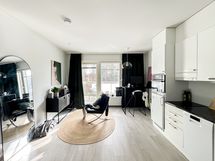 Tässä valoisassa ja vaaleasävyisessä kodissa on toimiva pohjaratkaisu, joka tekee arjesta sujuvaa. Siisti ja hyvin varusteltu avokeittiö yhdistyy luontevasti oleskelutilaan, ja säilytystilaa on mukavasti niin kaapistoissa kuin muissakin ratkaisuissa. Tilava kylpyhuone tarjoaa hyvin tilaa arjen toiminnoille, ja siellä on oma paikka pyykinpesukoneelle.