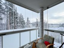 Kodin ehdoton kruunu on iso lasitettu parveke idän suuntaan, jolta avautuvat kauniit, metsäiset maisemat – täydellinen paikka nauttia aamukahvista tai rentoutua päivän päätteeksi.