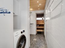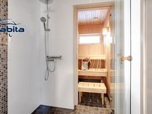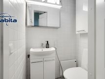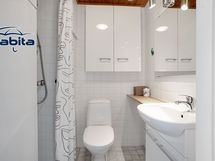 - Suihku, Pesukoneliitäntä, Mukavuuslattialämmitys, Käsisuihku, Kaapisto, Allas, WC-istuin, Peili, Peilikaappi