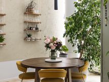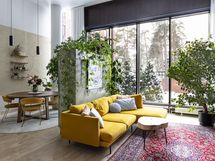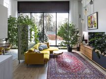 Asunnon sydän on valtava, avoin oleskelutila, jonka huonekorkeus kohoaa lähes viiteen metriin. Isot ikkunat suuntautuvat iltapäiväaurinkoon – täällä viihtyvät niin asukkaat kuin viherkasvitkin. Ikkunoista aukeaa näkymä luonnonsuojelualueelle, ja puiden lomasta saattaa keväisin ja syksyisin pilkottaa myös meri.
