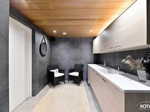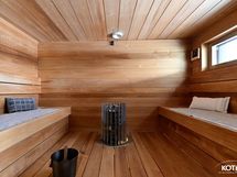 - Kiuas: Sähkökiuas. Tyylikäs tilava sauna Hello Rocher pilarikiukaalla. Ikkuna ulos.