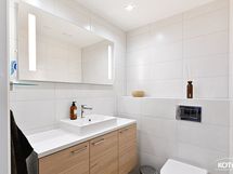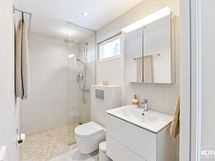 Varustus: allaskaappi, valopeili, seinä-wc, lattialämmitys ja lattiakaivo (yläkerta). Lattia: laatta. seinät kaakeli.