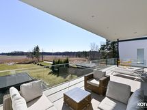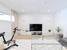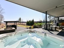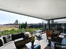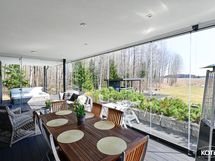 - Alakerrassa on noin 23 m² lasitettu terassi sekä ulkoterassi ulkoporealtaalla. Terassin materiaali on helppohoitoista komposiittia.