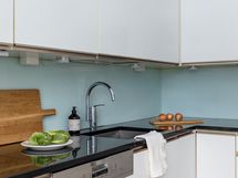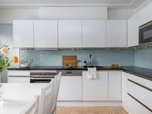 - Liesi: integroitu, induktio, erillisuuni. Työtasot: kivi. Kylmäsäilytys: jääkaappi, pakastin. Varustus: liesituuletin, mikroaaltouuni, astianpesukone. Keittiön yhteydessä kodinhoitohuone, jossa pakastin, siivouskomero ja paikka pesukoneelle. Keittiö uusittu 2009. Välitilan materiaali: lasi.