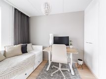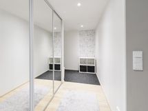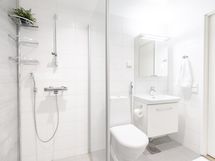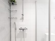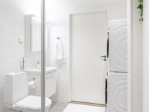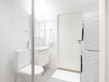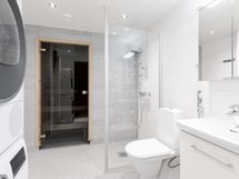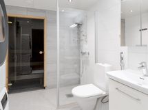 - Varusteet: suihku, suihkuseinä, peilikaappi, allaskaappi, pesukoneliitäntä, WC, lattialämmitys, kylpyhuonekaapistot, kiinteät valaisimet. Bideesuihku