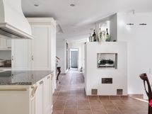 The heart of the house is a spacious living room, which seamlessly connects to the dining area. High ceilings and warm-toned materials create a cozy atmosphere in the space, which is emphasized by a beautiful fireplace. The kitchen is designed for cooking lovers: a custom-made Aran Cucine kitchen, granite countertops and Miele appliances make everyday life smooth. A genuine wood-fired baking oven brings added value and atmosphere.