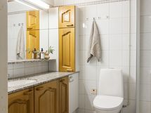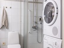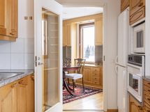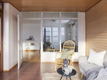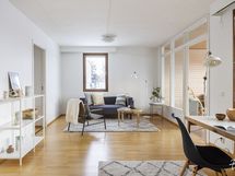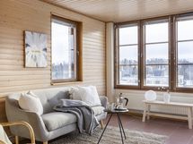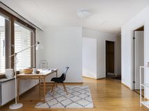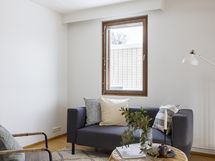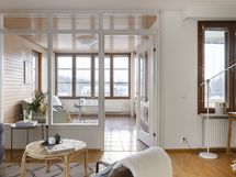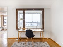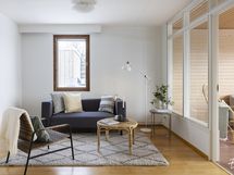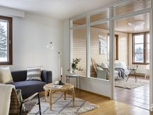 Olohuone on mielettömän kokoinen ja ruokailutila jää heti olohuoneen viereen, muodostaen avaran kokonaisuuden, jota suuret ikkunat rytmittävät kauniisti. Viherhuone tuo kotiin oman, tunnelmallisen lisätilansa - viihtyisä paikka ympäri vuoden. Viherhuoneesta on käynti parvekkeelle, jossa kelpaa viettää kesäiltoja istuskellen ja varhaiset aamukahvit omalla parvekkeella ovat arjen luksusta. Keittiö avautuu ruokailutilaan ja sen alkuperäiset tammikaapistot ovat siistit ja ajattomat. Säilytys- ja työskentelytilaa on mukavasti ja kokonaisuus on helposti päivitettävissäkin oman maun mukaan, jos näin haluaa.