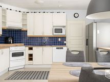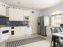 - Keraaminen liesi, liesituuletin, side-by-side jääkaappipakastin, astianpesukone. Lattia vinyylilankkua.
