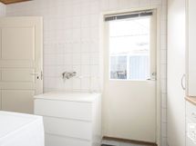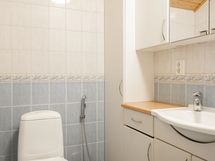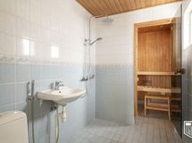 - Seinät ja lattia laatoitettu, lattialämmitys. Sadesuihku, pesuallas, wc-istuin, käsisuihku, ikkuna. WC: Erilliset wc:t ala- ja yläkerrassa. Seinät ja lattia laatoitettu. Wc-istuin, pesuallas, allaskaapisto, käsisuihku.